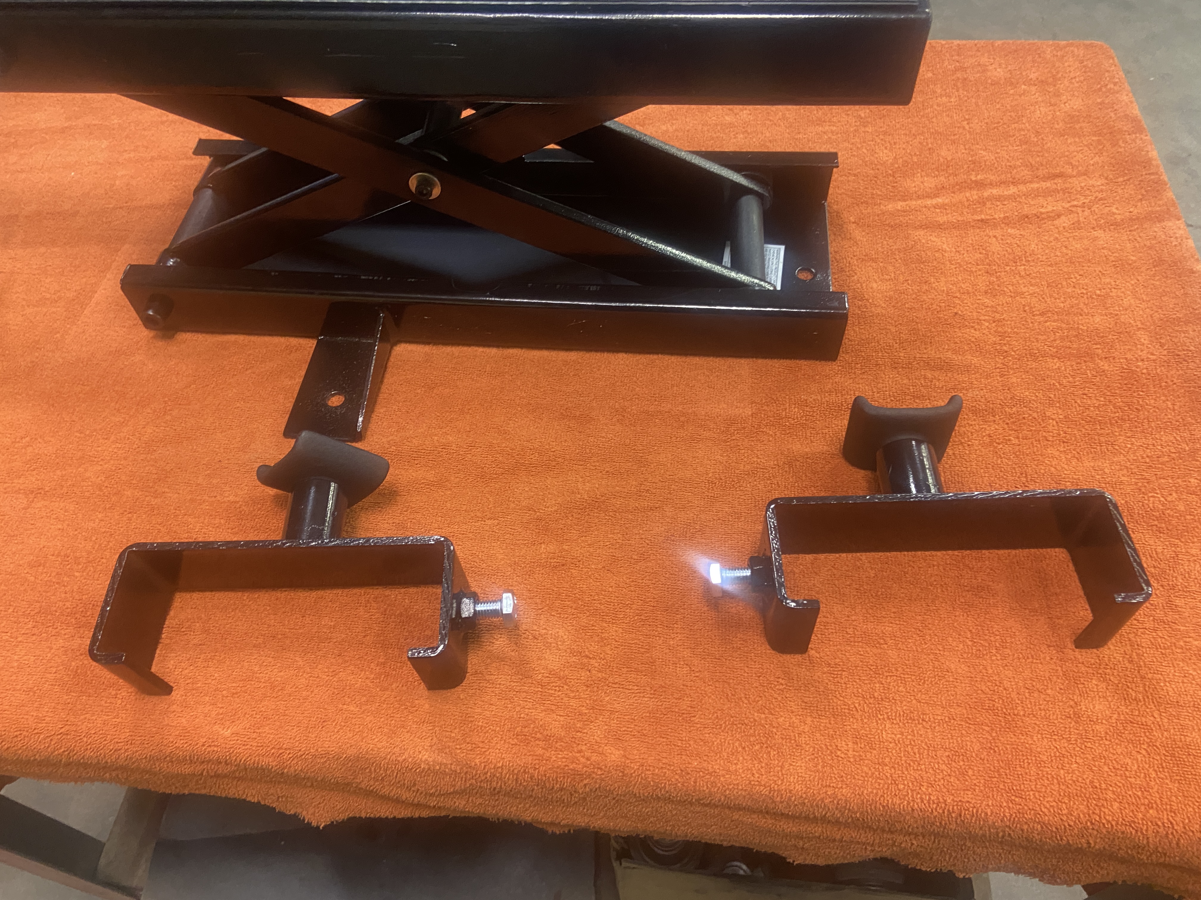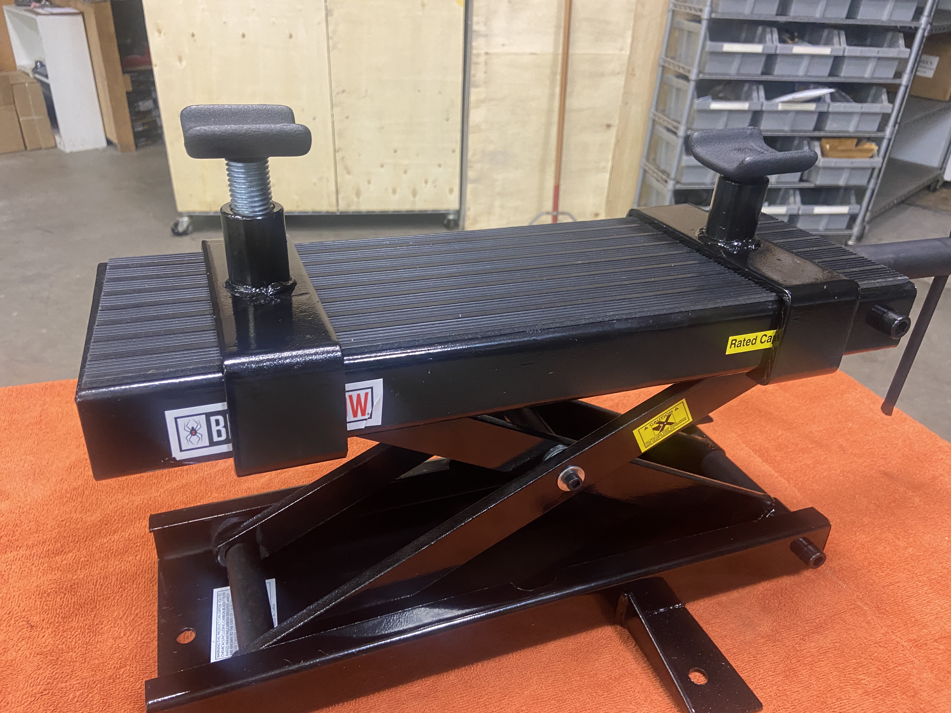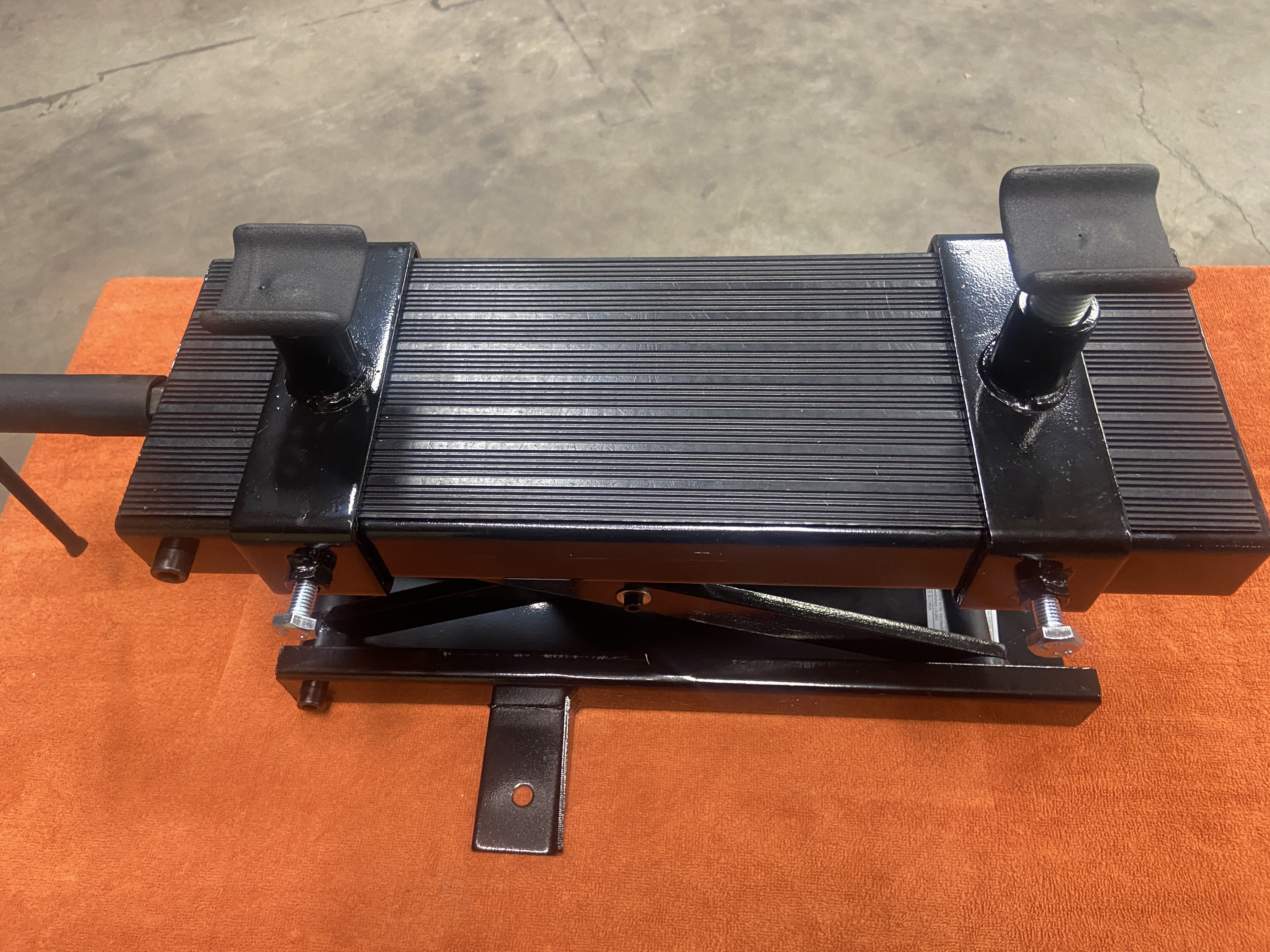 Details The lift range of the motorcycle jack is 3-3/4" to 16-1/4" high. To prevent frame tube paint damage rubber padding has been added to the top of each removable adapter. To increase stability a foot is welded onto each side of the jack base.